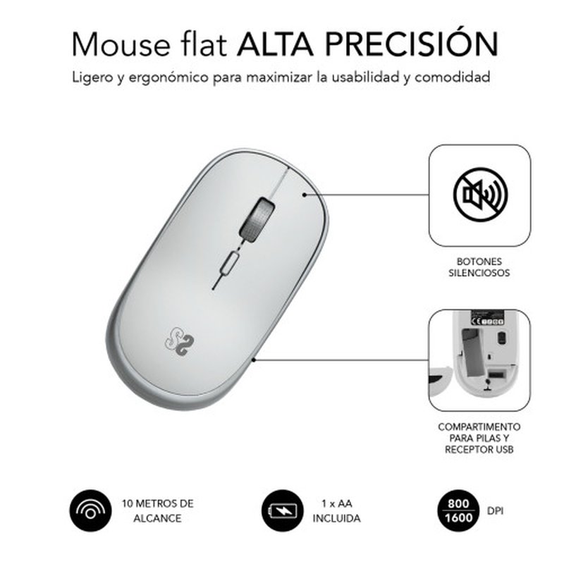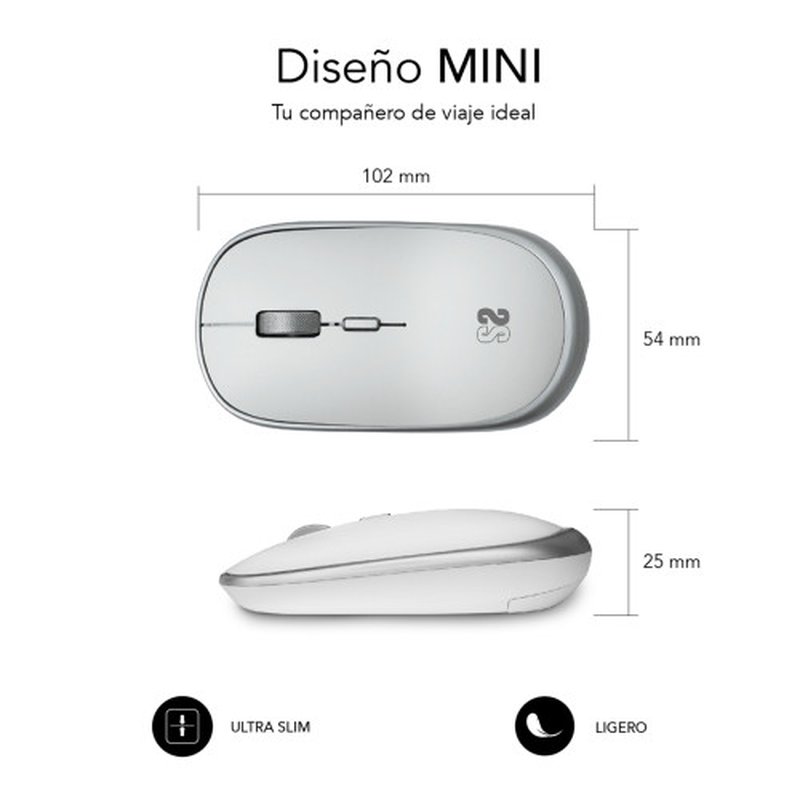 El más pequeño de los Mouse Subblim, para llevar a cualquier parte y conectarte rápidamente a tu dispositivo mediante el receptor de radiofrecuencia USB. Es ligero, silencioso y preciso, poco más se le puede pedir a un ratón portable para ser perfecto. El diseño elegante de líneas sencillas y el acabado de calidad completan las características para convertirlo en el ratón ideal para trabajar desde cualquier parte.Silencioso. La tecnología Silent Click hace muy silencioso a este ratón, por lo que es ideal para entornos de oficina, para llevártelo a la biblioteca o para esos trabajos que se alargan por la noche.Precisión regulable. Este mini ratón está diseñado para que puedas usarlo con dispositivos de diversas resoluciones y en múltiples superficies, por eso puedes adaptar la sensibilidad del sensor óptico desde los 800 dpi, 1200 dpi hasta los 1600dpi Acabados de calidad. Los materiales de este ratón son de gran calidad, no solo para darle un aspecto profesional sino también para hacerlo más duradero y que te lo puedas llevar a cualquier parte sin miedo.Ambidiestro. Su diseño permite usarlo indistintamente con ambas manos y gracias a su ergonomía permite el uso continuado con menor fatiga de la muñeca.4 botones para mejorar la experiencia de uso. Cuenta con un botón de acceso directo al cambio de resolución que nos permite elegir rápidamente entre 800/1200/1600 dpi. Además del botón izquierdo, el derecho y la rueda metálica de desplazamiento.Ahorro de energía. Funciona con una pila AA que va incluida. Pero para que no temas por las pilas, el ratón Wireless Mini se pondrá en modo inactivo cuando dejes de usarlo. Para volver a trabajar solo tienes que presionar cualquier tecla y volverá a activarse.
