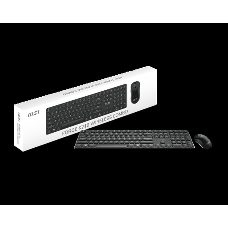 MSI FORGE K210 WIRELESS COMBO. Formato del teclado: Completo (100%), Tecnología de conectividad: Inalámbrico, Interfaz del dispositivo: USB, Interruptor del teclado: Interruptor mecánico, Uso recomendado: Hogar / Oficina. Color del producto: Negro. Ratón incluido