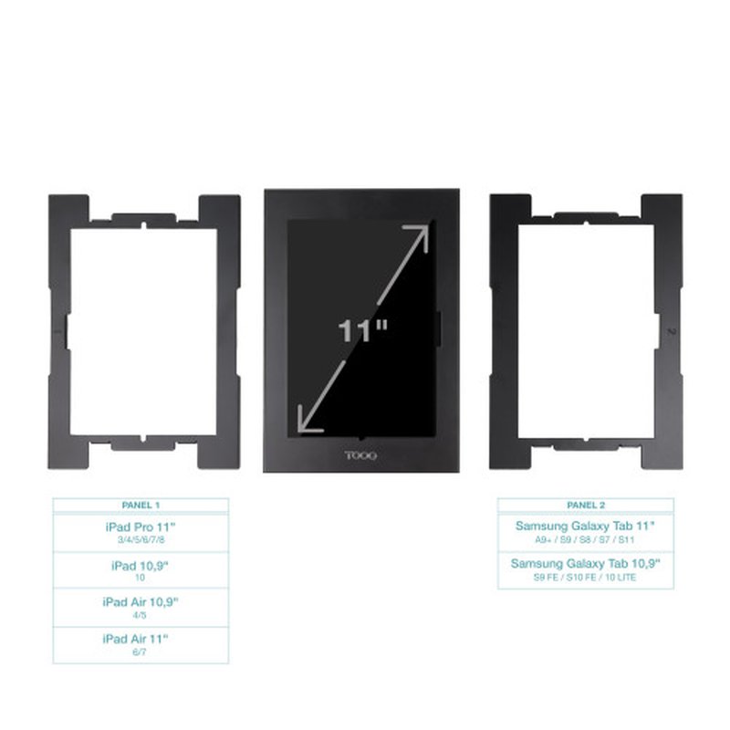 Marco antirrobo con cerradura a llave para tablets de 11”Tablets compatibles:- 11”: Samsung Galaxy TAB A9+, Samsung Galaxy TAB S9, Samsung Galaxy TAB S8, Samsung Galaxy TAB S7, Samsung Tab S11, iPad Pro3, iPad Pro4, iPad Pro5, iPad Pro6, iPad Pro7, iPad Pro 8, iPad Air6, iPad Air 7- 10,9”: Samsung Galaxy TAB S9 FE, Samsung Tab S10 FE, Samsung Tab S10 Lite, iPad Air4,iPad Air5, iPad 10Compatible con VESA 75x75Ranuras para un fácil acceso a todos los botones, cámara y cable de alimentación de la Tablet.Incluye dos paneles frontales para escoger el que mejor se adapte al dispositivo.Permite instalación directa en pared o montaje sobre soporte con VESA 75×75, como los modelos TQATC2601-B y TQATWM3401-B, entre otros.Almohadillas de protección para evitar arañazos y mejorar la sujeción.Peso máximo soportado: 1 KgColor: NegroMaterial: fabricado en acero de alta calidadMedidas del producto: 220x323x22 mmPeso Neto: 1,680 Kg Peso bruto: 1,780 KgMedidas embalaje: 225x380x33 mm